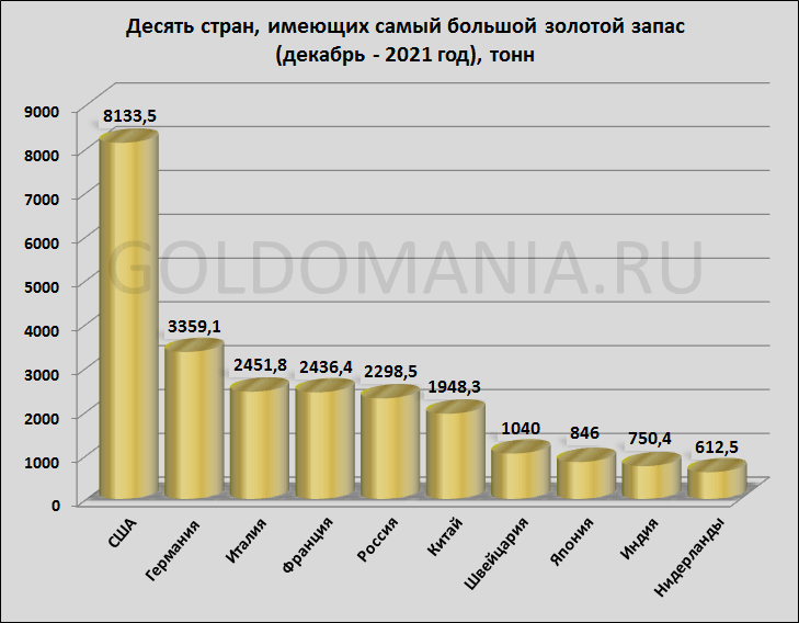 1США - бесспорный лидер по объему золотых запасов во всем мире. На начало 2021 года в хранилищах страны находилось